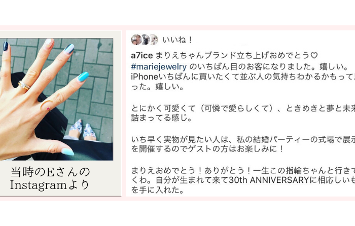 普段は10万円もの買い物はしないのでドキドキでしたが、指輪に魅了されて、 どうしても欲しい!という気持ちでした。マリエジュエリーは奇抜なデザインが多いように 感じるかもしれませんが、どれも洗練されていて、実はシンプル。