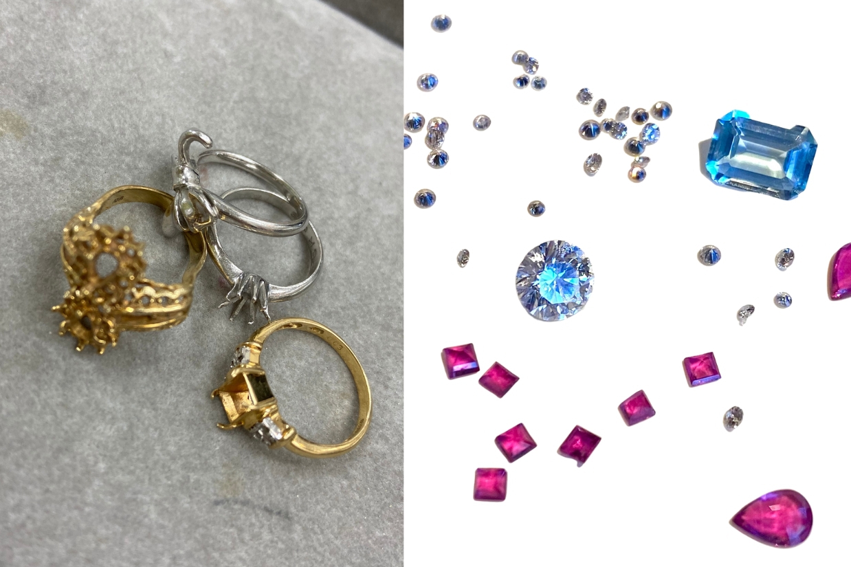 使用するのはお預かりしたリングから石外しをした、素晴らしい品質のダイヤモンドと様々な形のルビーです。
