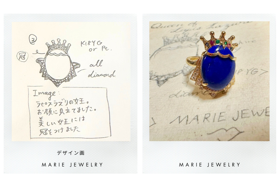 お会いした際、その洗練されたセンス、 内側からあふれる好奇心と冒険心が大変印象的でした。 その魅力をそのままデザインに落とし込み、 ラピスラズリの神秘的な輝きを引き立たせながらも、 遊び心のある唯一無二のリングとして形にいたしました。
