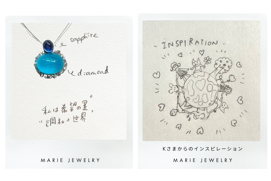 ヘミモルファイトの持つ、澄んだ空のようなブルーは、 K様の優しさや穏やかな心と重なり、「希望の星」や 「調和の世界」をテーマにデザインさせていただきました。 受け継がれた宝石と新たに加わったストーンが調和し、 唯一無二の輝きを放つジュエリーへと生まれ変わりました。 こうして生まれ変わったジュエリーが、これからの毎日に そっと寄り添い、たくさんの幸せを運んでくれることを願っています。