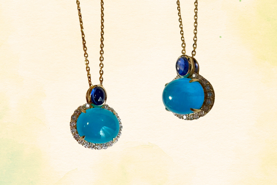 カボションカットのサファイアとダイヤモンドに、K様の イメージカラーとしてぴったりだと感じたヘミモルファイトを メインストーンに添えたネックレスを制作させていただきました。